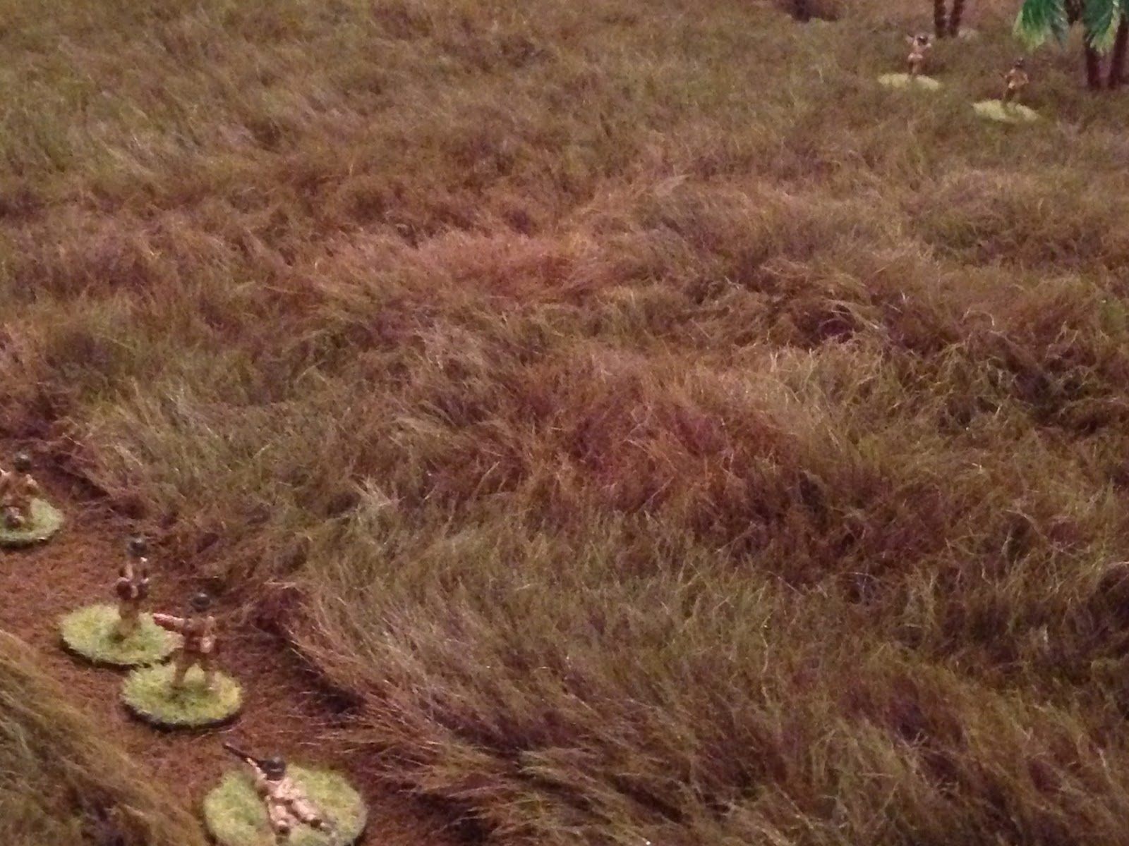 Overview of table, north is to top left, with the village of Dadangan at top right. It's 0830 on 13 Dec 1941, and Captain Moon's 1st Platoon enters the table at bottom center left, via the dirt road, moving east towards the Filipino village. The ridge on the left is Hill 100, the knob at top right is Hill 125. Mostly open grasslands, with some coconut palms scattered here and there. The table is 6' x 4', a drastic change from my norm of playing on 2' x 2' tables!