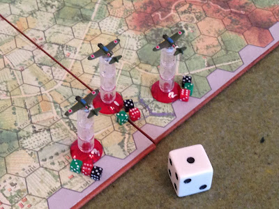 In the southwest, Captain Chandler is once again up in Dirty 01, as is Lt Gardner, in Dirty 04. Capt Chandler is okay after receiving shell splinters in his upper back during the first fight, and Lt Gardner showed up at the base with nothing more than hurt pride after being shot down in that same engagement. Capt Chandler is a Veteran pilot, while Lt Gardner is a Regular. They are also at speed 5/alt 5, having just rapidly climbed to get into the fight.