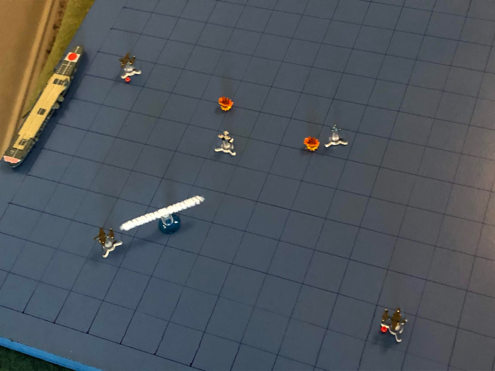 This is my arena for aerial combat; simple, yet durable and, to me, beautiful (in a simple, durable way). I'm using tiny aircraft designed by my buddy Thomaston; not sure what size they are, just that they are much smaller than 1/600. They're 3D printed models that I mounted on cut-down bases from Litko, and I'm using a very simple rules system called "Battle of Britain," which I found for free over on The Miniatures Page (I've already played a good 20 or so fights with them). Left is north, with the Japanese CAP there, and the American strike group at right.